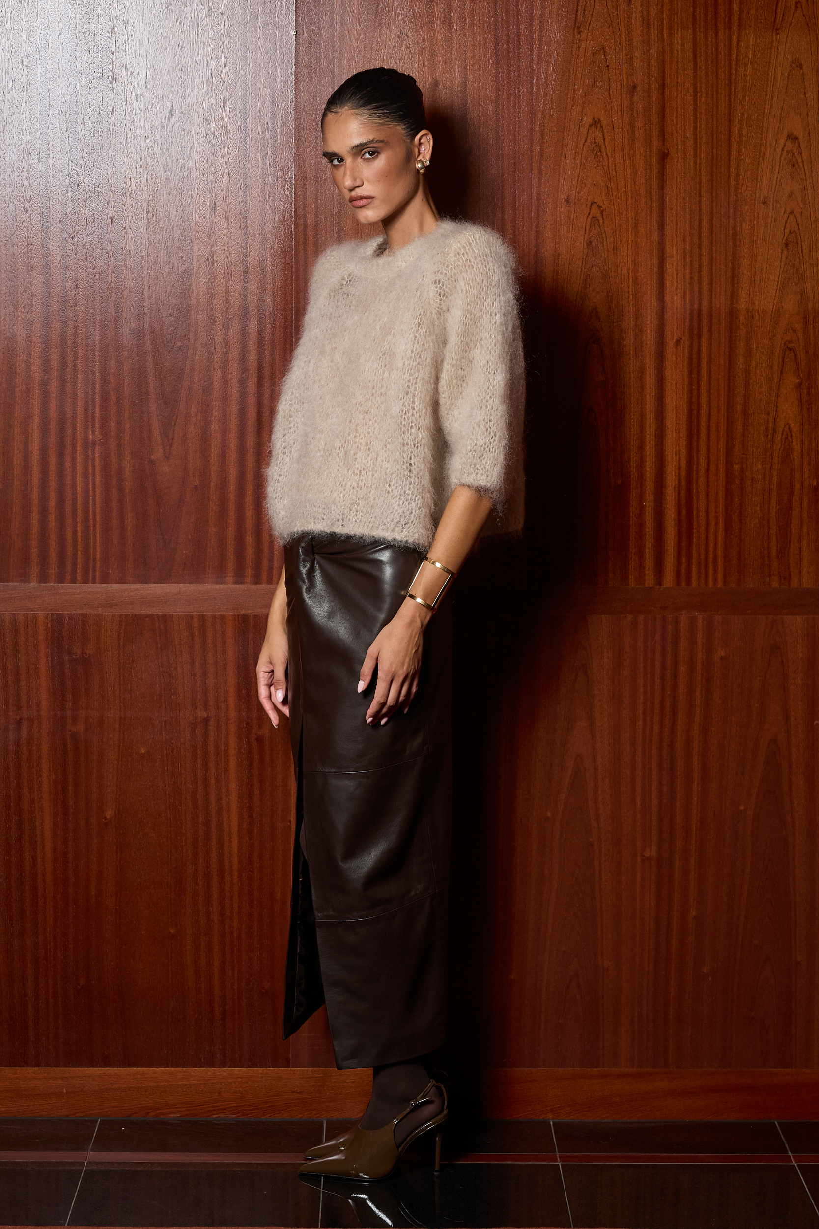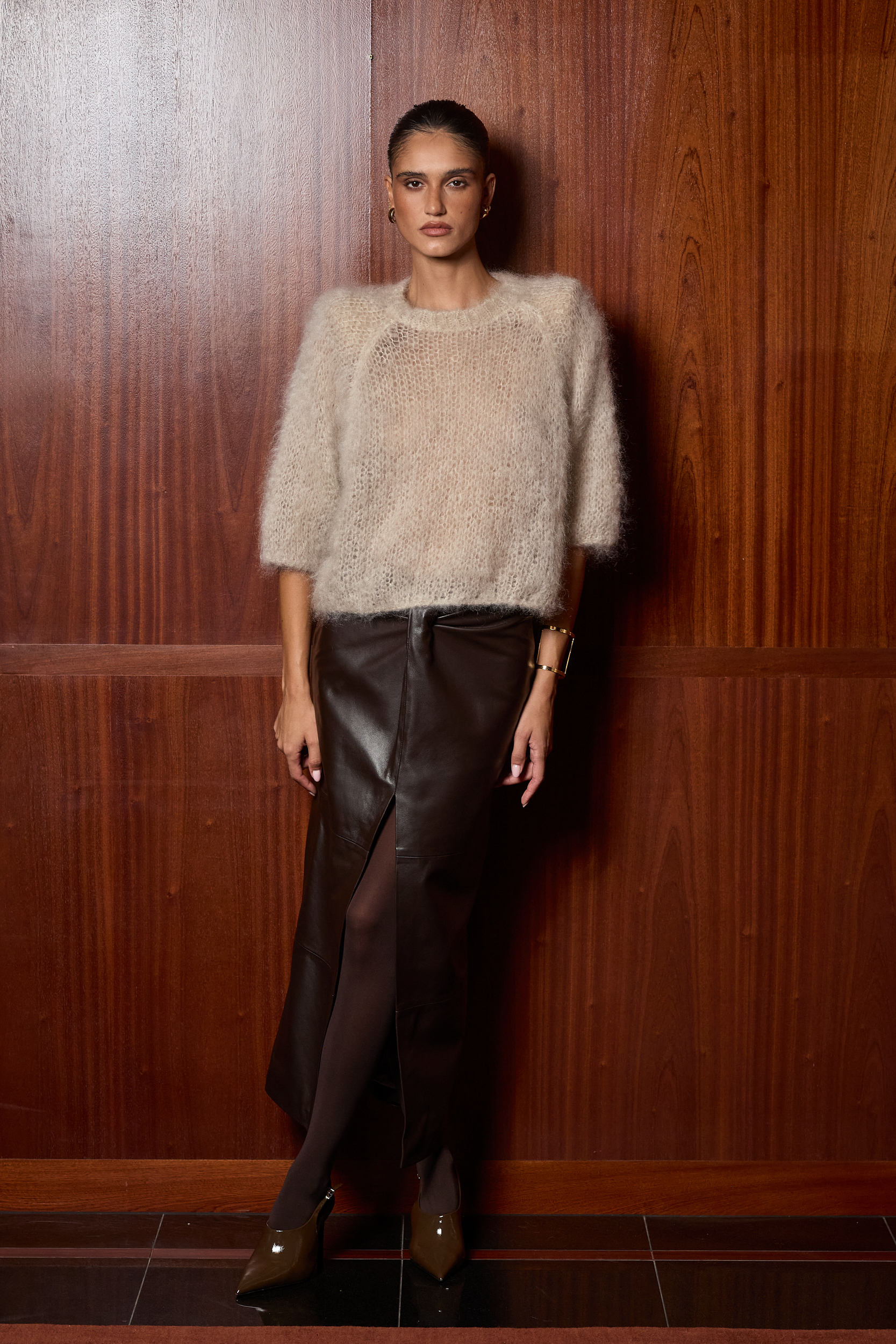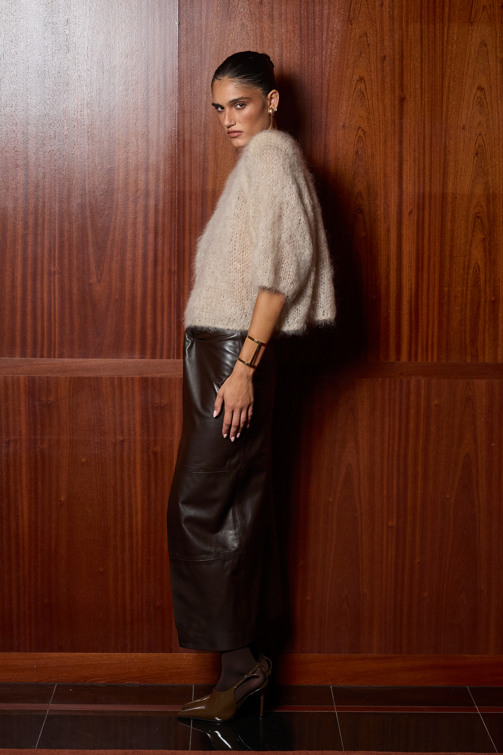 Sweter wykonany z puszystego moheru, wyróżnia się miękką, ażurową strukturą, która delikatnie otula sylwetkę, zachowując jednocześnie wrażenie subtelnej lekkości. Neutralny, kremowo-beżowy odcień podkreśla jego luksusowy, a zarazem uniwersalny i ponadczasowy charakter, sprawiając, że świetnie komponuje się z elegancką, jak i bardziej codzienną stylizacją. Charakterystycznym elementem swetra są przypinane poduszki w ramionach. To rozwiązanie nadaje sylwetce bardziej wyrazistą, geometryczną linię, jednocześnie pozwalając na pełną personalizację – w zależności od okazji można je nosić lub odpiąć, uzyskując bardziej miękki, casualowy efekt. Dzięki temu sweter staje się jeszcze bardziej wszechstronny: od delikatnej, codziennej odsłony po wyrazistą stylizację z modowym akcentem.