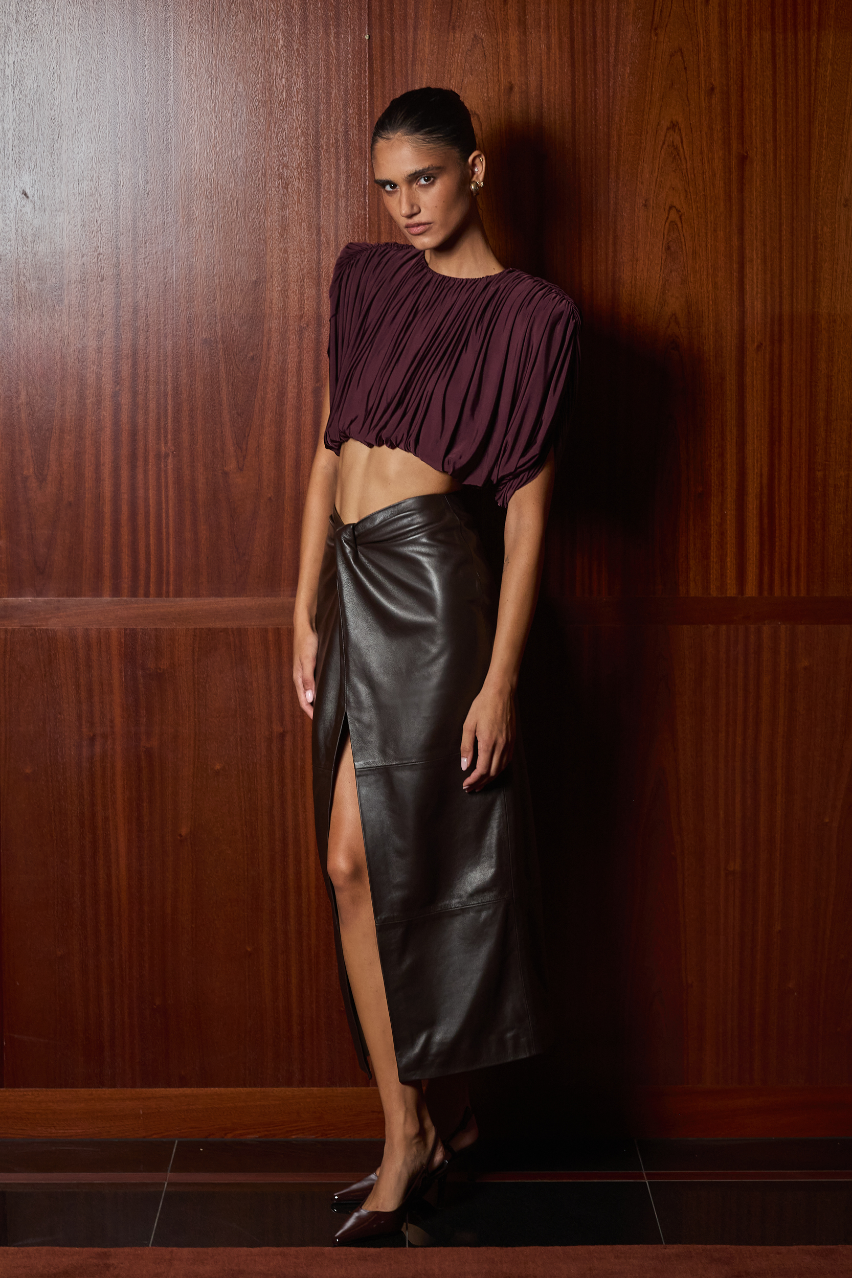 Top wykonany z wysokogatunkowego jerseyu premium w kolorze głębokiego burgundu to idealny wybór dla kobiet ceniących nowoczesną elegancję i wyrafinowany minimalizm. Uszyty z luksusowego materiału, wyróżnia się subtelnym połyskiem i lekkością. Charakterystycznym elementem topu są marszczenia na całej linii topu, które nadają topowi wyjątkowej struktury i rzeźbiarskiej formy oraz asymetryczne rękawy – jeden lekko poszerzony, drugi opadający w bardziej swobodny sposób. Taki detal przełamuje klasyczną formę, wprowadzając nowoczesny i artystyczny akcent do stylizacji. To subtelna gra proporcji, która sprawia, że top wygląda dynamicznie i wyjątkowo. Wbudowane w ramiona poduszki dodają sylwetce wyrazistości. Krótki, swobodny fason zakończony nad linią talii doskonale komponuje się z dopasowaną spódnicą lub spodniami. To propozycja dla kobiet, które poszukują w modzie nie tylko luksusu, ale także odrobiny awangardy.