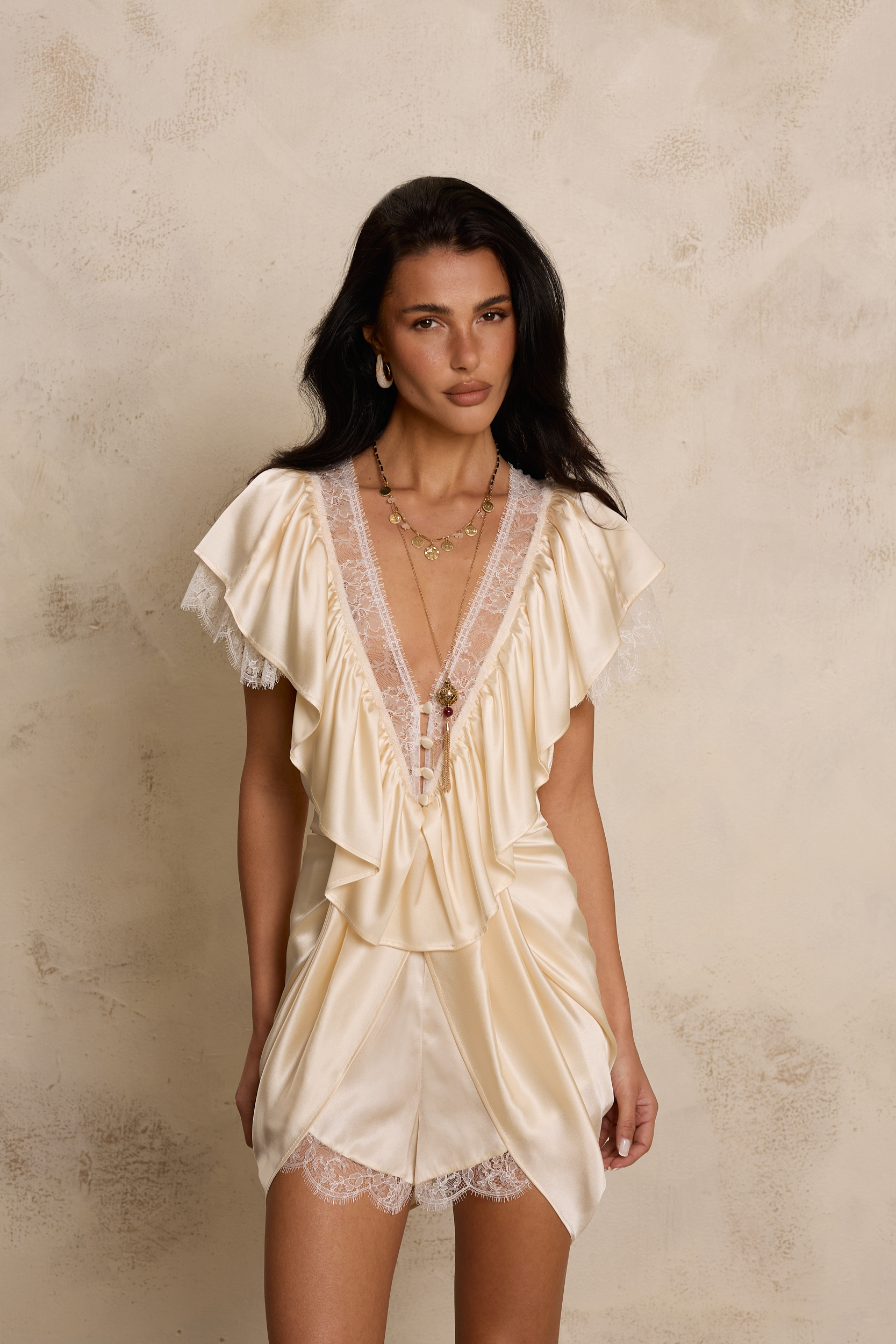 Zaprojektowany z myślą o kobietach, które cenią luksus w jego najbardziej wyrafinowanej formie, ten wyjątkowy kombinezon łączy w sobie szlachetność naturalnego jedwabiu z delikatnością francuskiej koronki. To propozycja, która zachwyca nie tylko wyglądem, ale przede wszystkim jakością wykonania i dbałością o najmniejszy detal. Miękki, oddychający jedwab otula ciało niczym druga skóra, zapewniając niezrównany komfort noszenia i subtelny, naturalny połysk. Starannie wykończone wstawki z francuskiej koronki dodają całości romantycznego charakteru, podkreślając kobiecość i lekkość sylwetki. Kombinezon utrzymany jest w eleganckim, szampańskim odcieniu – ciepłym, subtelnie połyskującym kolorze, który doskonale współgra z naturalnym blaskiem jedwabiu. Ten wyrafinowany ton dodaje stylizacji luksusowego charakteru i pięknie podkreśla skórę, nadając całości wyjątkowej lekkości. Zwiewne falbany, precyzyjne marszczenia oraz dopracowany krój tworzą harmonijną kompozycję, która pięknie układa się na ciele i eksponuje jego atuty. Każdy element – od delikatnych guzików po misternie dobrane zdobienia – świadczy o kunszcie rzemiosła i pasji do tworzenia rzeczy wyjątkowych. Kombinezon doskonale komponuje się z dłuższą kurtką z kremowej skóry licowej, tworząc nowoczesny, kontrastowy look – zestawienie lekkości jedwabiu i koronki z wyrazistą formą skóry podkreśla jego wyjątkowy charakter i nadaje stylizacji modowej głębi.