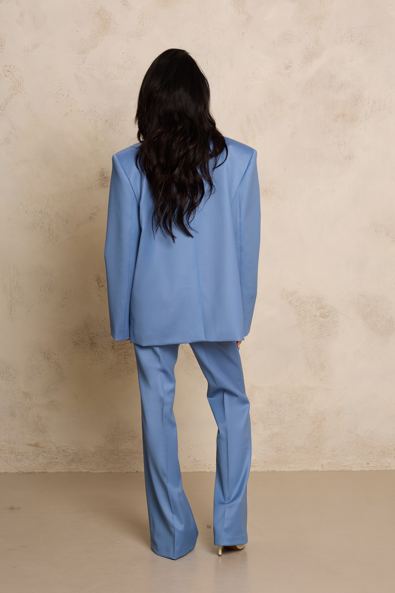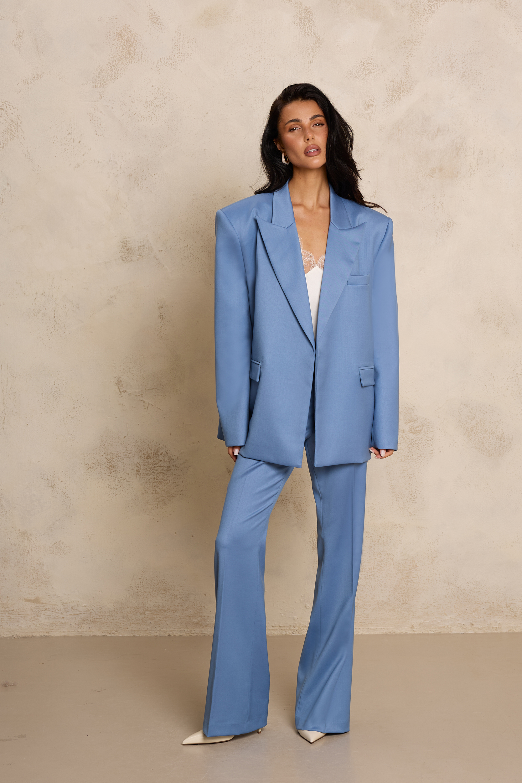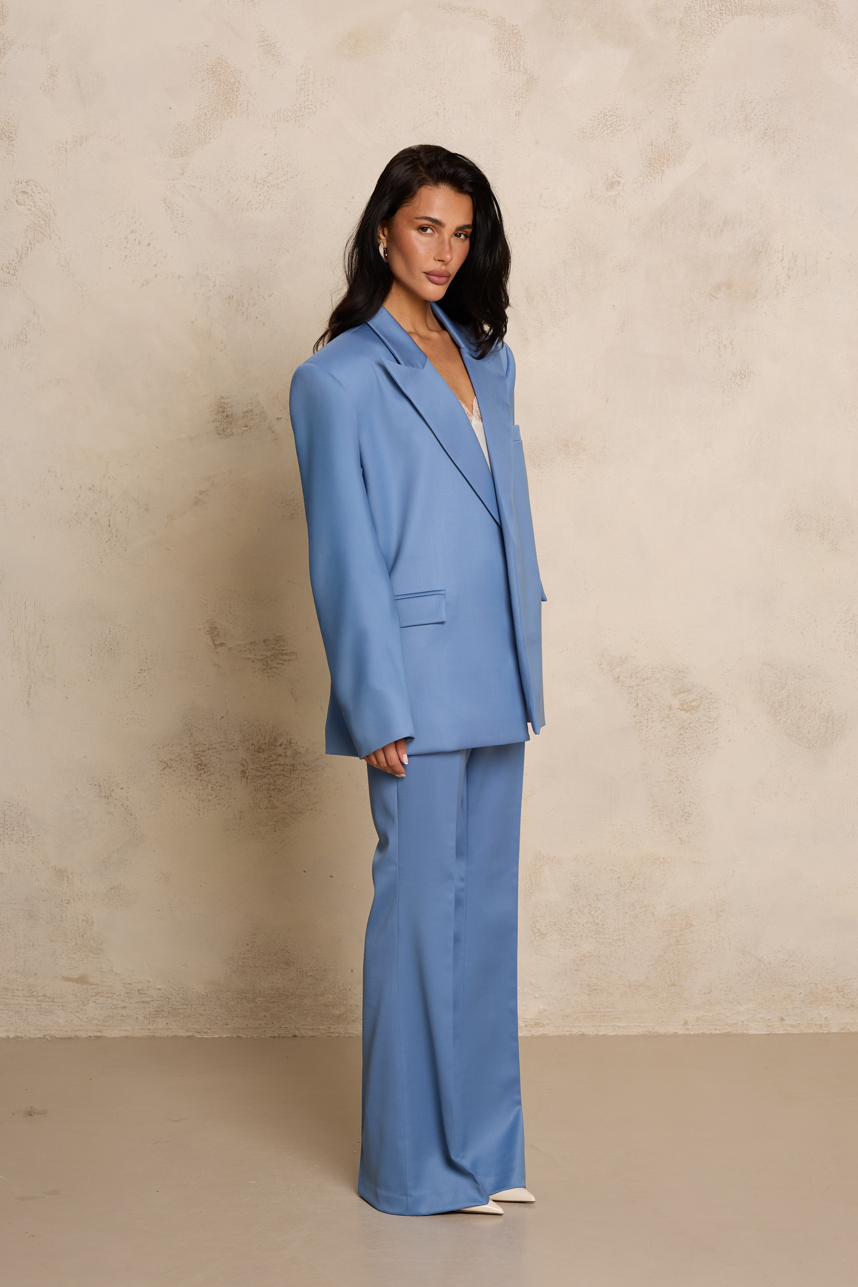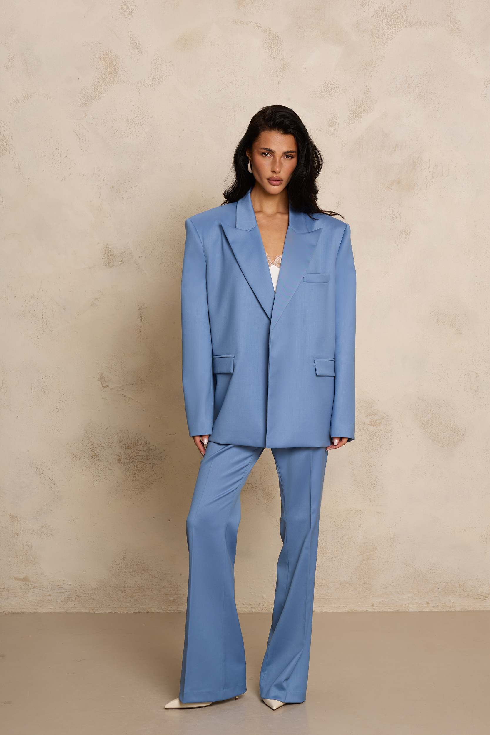 Oversizowa marynarka wykonana z wysokiej jakości jedwabnej wełny, która łączy elegancję z nowoczesnym, swobodnym krojem. Model w odcieniu dusty blue – najmodniejszym w tym sezonie odcieniu niebieskiego – wyróżnia się wyrafinowaną, przygaszoną tonacją, która dodaje stylizacjom świeżości i subtelnej elegancji. Luźniejsza forma oraz wyraźnie zaznaczona, poszerzona linia ramion nadają sylwetce nowoczesnego, modowego charakteru. Klasyczne klapy, minimalistyczne zapięcie oraz starannie wykończone kieszenie podkreślają krawiecki kunszt i ponadczasowy styl. Delikatnie lejąca, a jednocześnie strukturalna tkanina pięknie układa się na sylwetce, zapewniając komfort noszenia. Marynarka doskonale komponuje się zarówno z jedwabnym topem, jak i ze spodniami z tej samej tkaniny, tworząc nowoczesny, monochromatyczny garnitur.