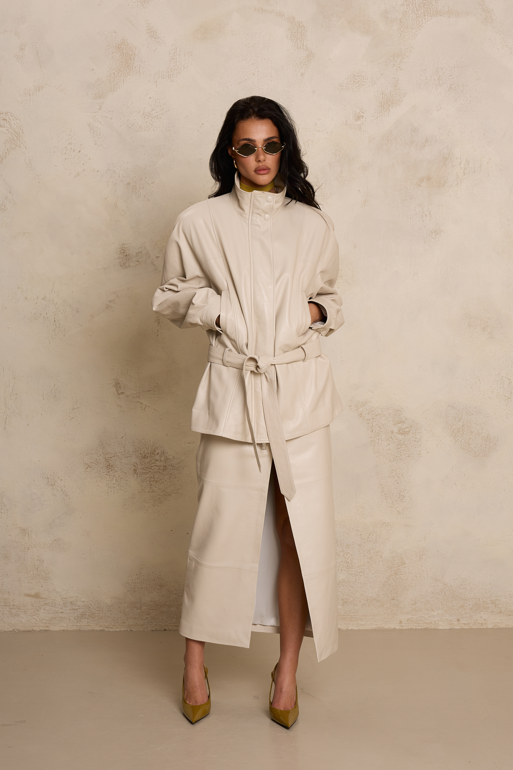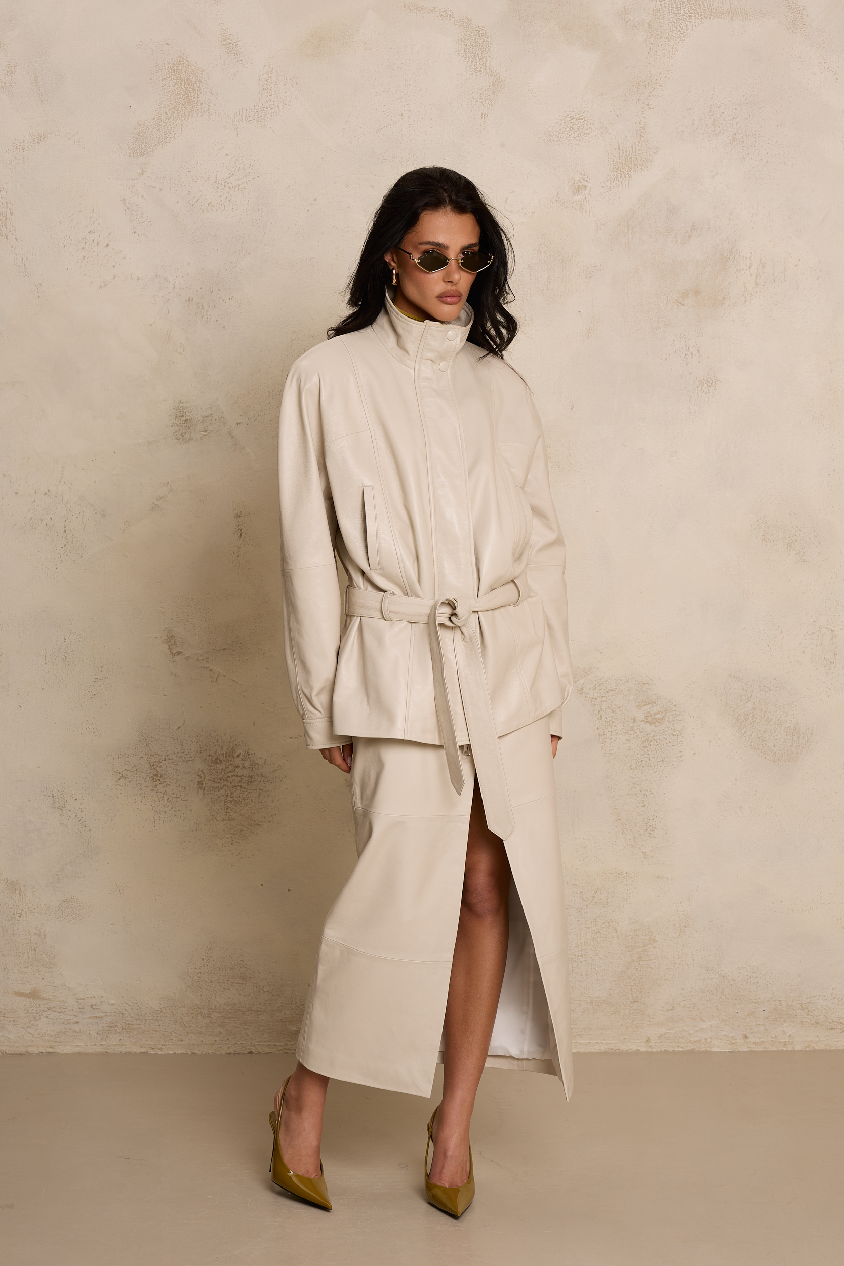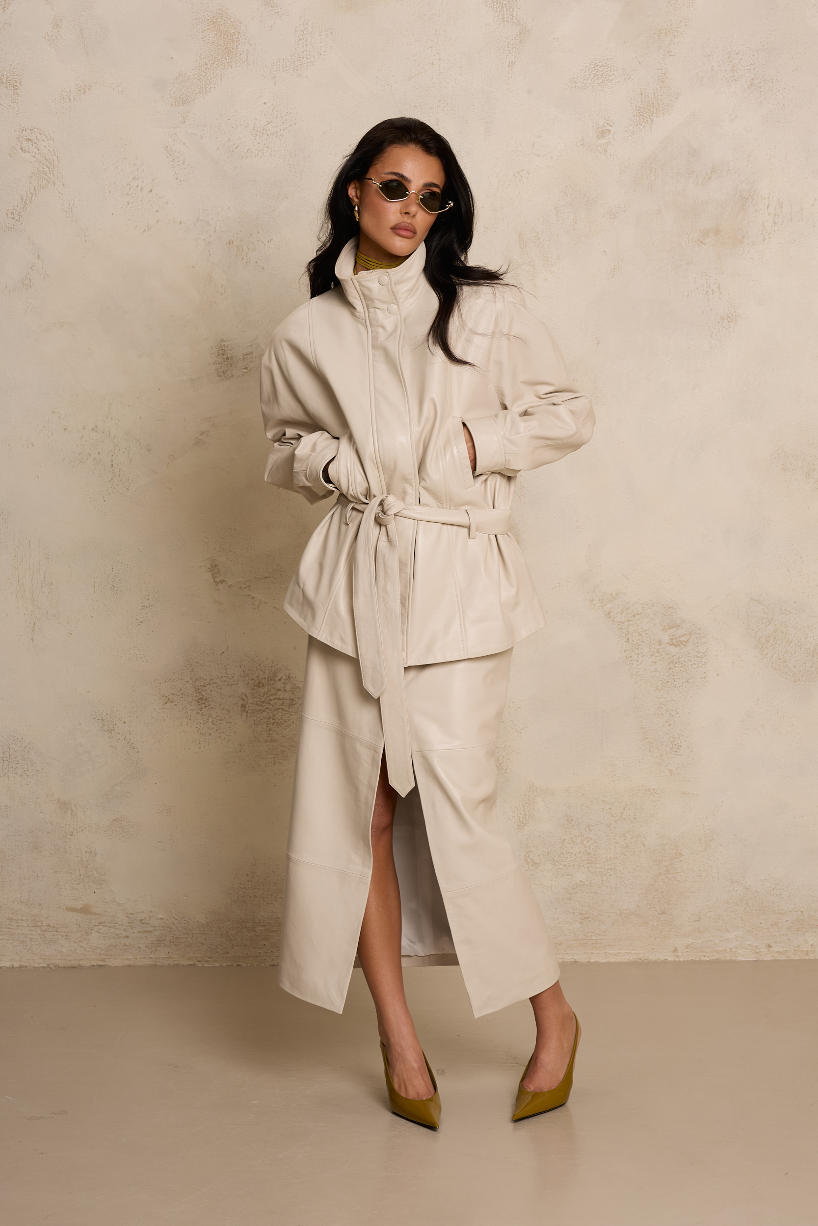 Kurtka Kelly, uszyta z wyselekcjonowanej, naturalnej skóry licowej w przepięknym perłowo-kremowym kolorze zachwyca swoją szlachetnością, miękkością i perfekcyjnym wykończeniem. To ponadczasowy element garderoby, który łączy funkcjonalność z wyrafinowanym stylem. Starannie dopracowany krój z lekko oversize’ową linią zapewnia komfort noszenia, jednocześnie podkreślając nowoczesny charakter projektu. Wysoka stójka, minimalistyczne zapięcie w postaci skórzanych nap oraz pasek w talii pozwalają na indywidualne dopasowanie i modelowanie sylwetki. Precyzyjne przeszycia, dbałość o proporcje i detale świadczą o rzemieślniczej jakości wykonania – każdy element został zaprojektowany z myślą o trwałości i estetyce. Kurtka utrzymana jest w eleganckim, jasnym odcieniu o kremowej, neutralnej tonacji. Ten ponadczasowy kolor doskonale wpisuje się w minimalistyczną estetykę i sprawia, że model z łatwością łączy się z innymi elementami garderoby, dodając stylizacjom lekkości i klasy. Jej wydłużona forma sięgająca za biodra nadaje sylwetce smukłości i podkreśla nowoczesny charakter projektu. Ta długość nie tylko zapewnia większy komfort i ochronę, ale także pozwala na tworzenie bardziej warstwowych stylizacji, na przykład z jedwabną sukienką, czy kombinezonem z koronką, tworząc wyrafinowane zestawienie kontrastów – miękkości i lekkości jedwabiu i koronki z wyrazistą strukturą skóry. Równie efektownie prezentuje się w komplecie ze skórzaną spódnicą wykonaną z tej samej skóry, tworząc spójny, nowoczesny total look o wyjątkowo eleganckim charakterze.