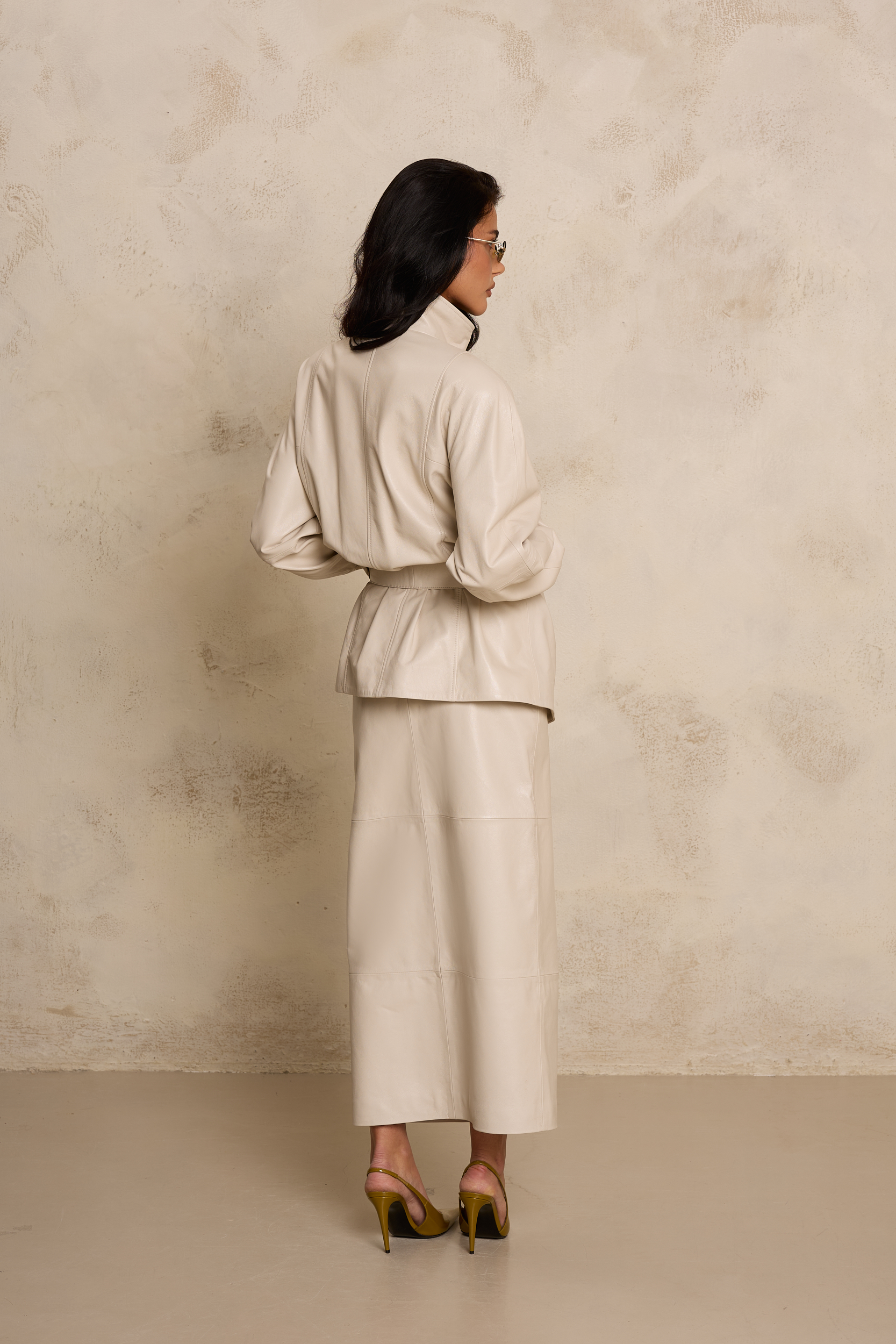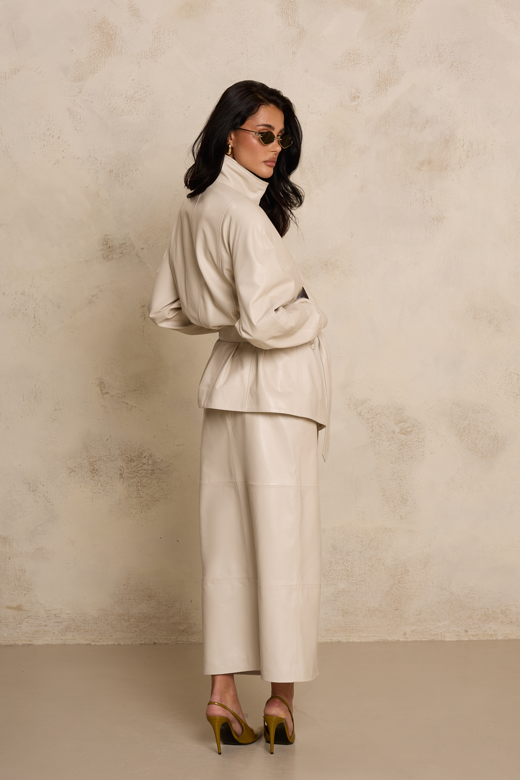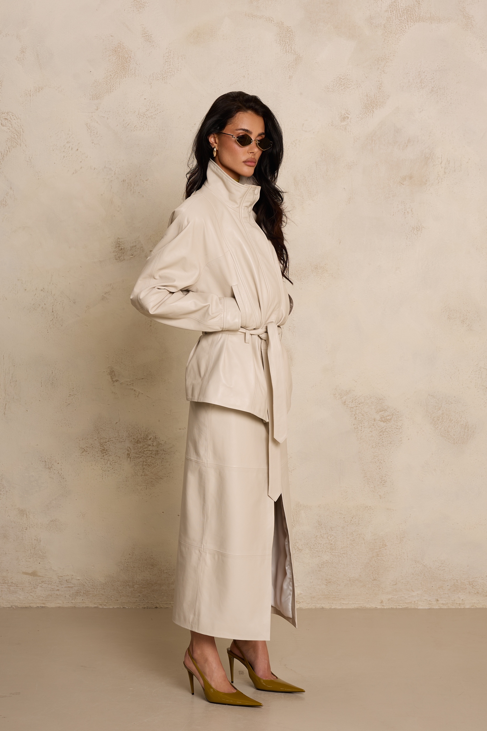 Kurtka Kelly, uszyta z wyselekcjonowanej, naturalnej skóry licowej w przepięknym perłowo-kremowym kolorze zachwyca swoją szlachetnością, miękkością i perfekcyjnym wykończeniem. To ponadczasowy element garderoby, który łączy funkcjonalność z wyrafinowanym stylem. Starannie dopracowany krój z lekko oversize’ową linią zapewnia komfort noszenia, jednocześnie podkreślając nowoczesny charakter projektu. Wysoka stójka, minimalistyczne zapięcie w postaci skórzanych nap oraz pasek w talii pozwalają na indywidualne dopasowanie i modelowanie sylwetki. Precyzyjne przeszycia, dbałość o proporcje i detale świadczą o rzemieślniczej jakości wykonania – każdy element został zaprojektowany z myślą o trwałości i estetyce. Kurtka utrzymana jest w eleganckim, jasnym odcieniu o kremowej, neutralnej tonacji. Ten ponadczasowy kolor doskonale wpisuje się w minimalistyczną estetykę i sprawia, że model z łatwością łączy się z innymi elementami garderoby, dodając stylizacjom lekkości i klasy. Jej wydłużona forma sięgająca za biodra nadaje sylwetce smukłości i podkreśla nowoczesny charakter projektu. Ta długość nie tylko zapewnia większy komfort i ochronę, ale także pozwala na tworzenie bardziej warstwowych stylizacji, na przykład z jedwabną sukienką, czy kombinezonem z koronką, tworząc wyrafinowane zestawienie kontrastów – miękkości i lekkości jedwabiu i koronki z wyrazistą strukturą skóry. Równie efektownie prezentuje się w komplecie ze skórzaną spódnicą wykonaną z tej samej skóry, tworząc spójny, nowoczesny total look o wyjątkowo eleganckim charakterze.