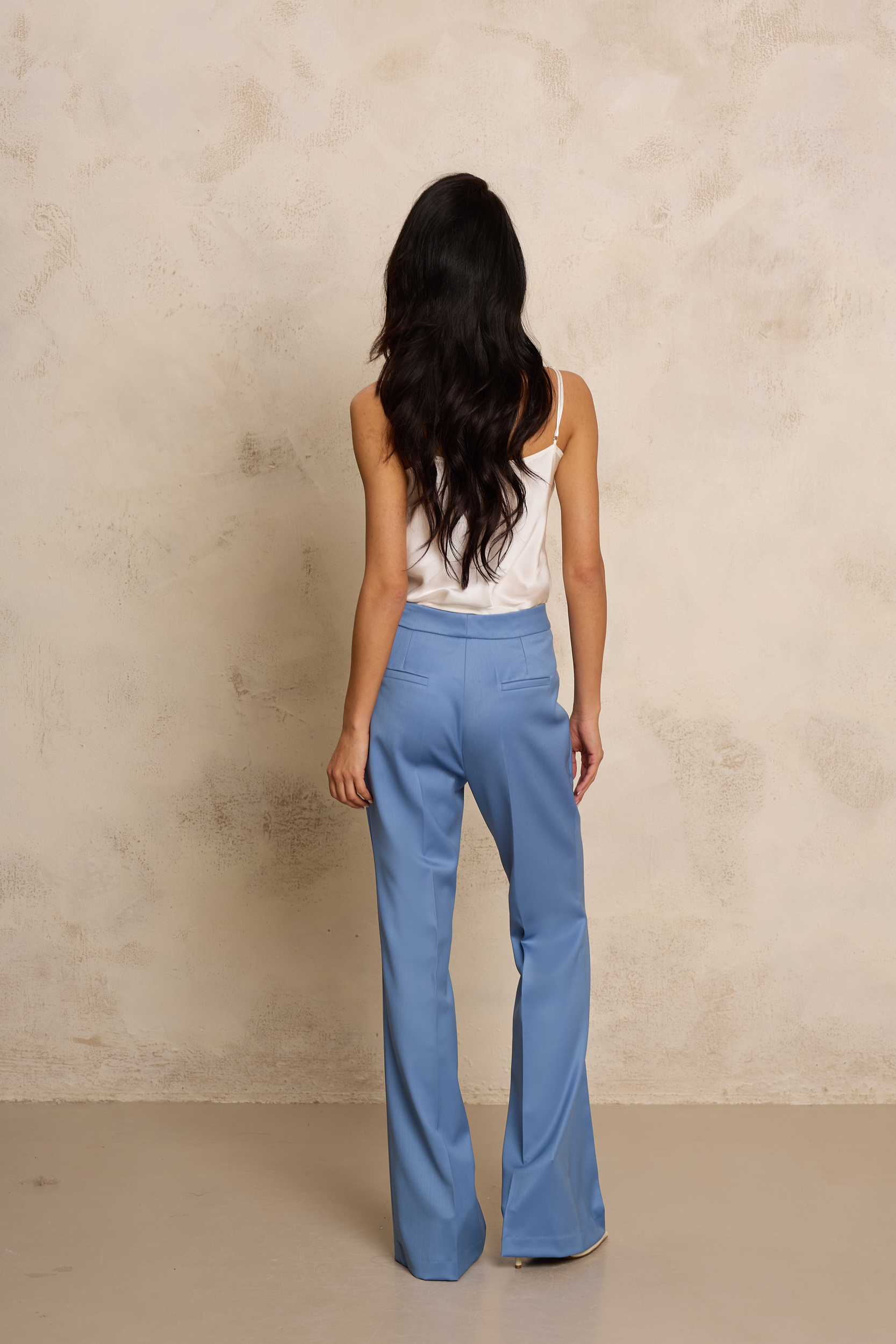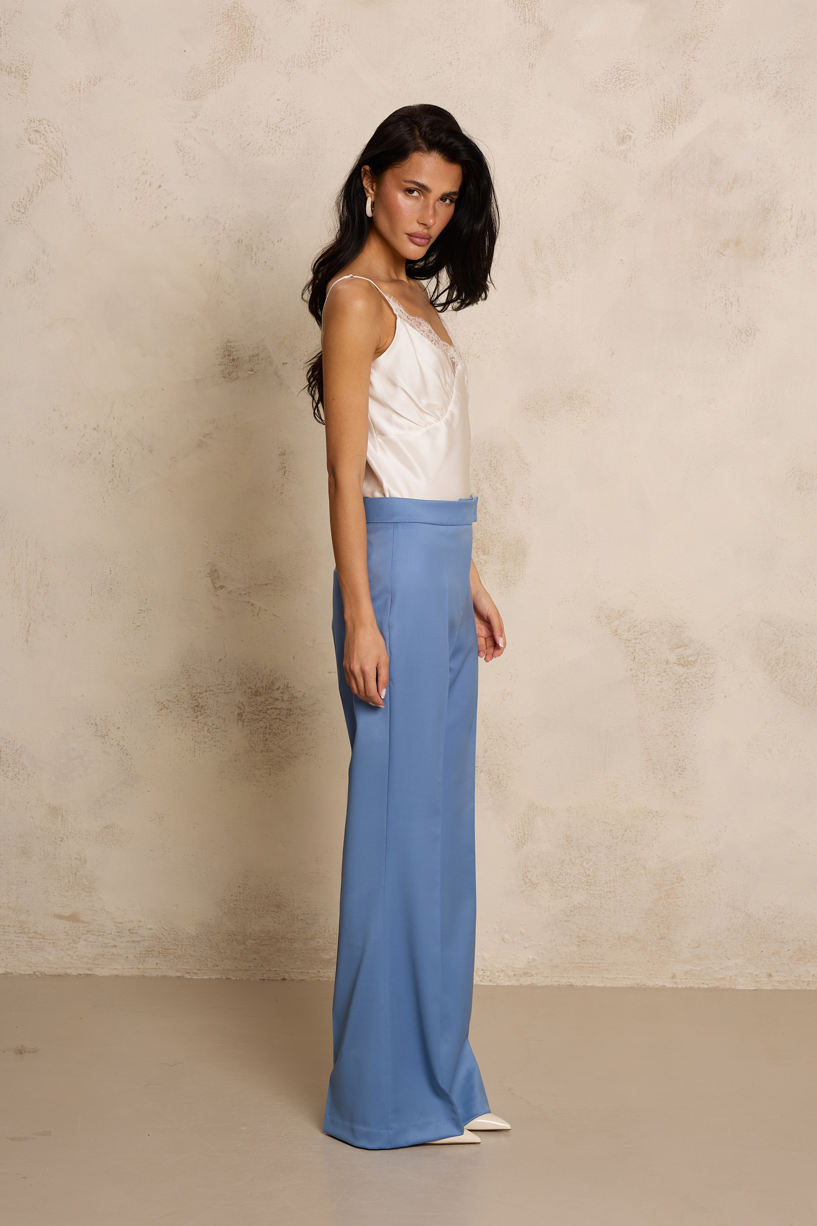 Eleganckie spodnie wykonane z wysokiej jakości jedwabnej wełny w odcieniu dusty blue – najmodniejszym w tym sezonie odcieniu niebieskiego. Subtelnie przygaszona tonacja nadaje stylizacji nowoczesnego, wyrafinowanego charakteru i doskonale wpisuje się w aktualne trendy. Model o dopasowanej linii w biodrach i talii płynnie przechodzi w lekko rozszerzaną nogawkę, która optycznie wydłuża sylwetkę i nadaje jej lekkości. Starannie wyprofilowany pas oraz minimalistyczne wykończenie podkreślają krawiecki charakter projektu, zapewniając jednocześnie komfort noszenia. Spodnie świetnie prezentują się w zestawie z marynarką VENETTA z tej samej tkaniny, tworząc nowoczesny, monochromatyczny garnitur.