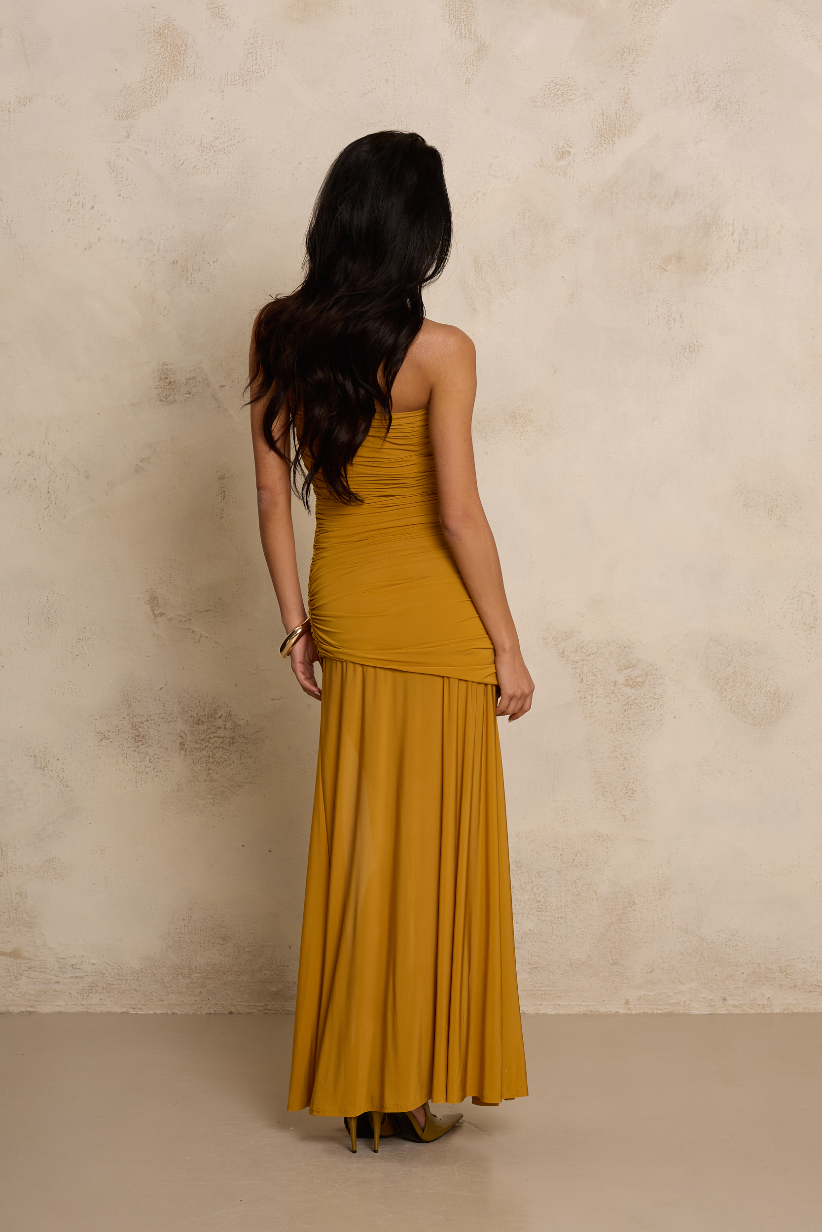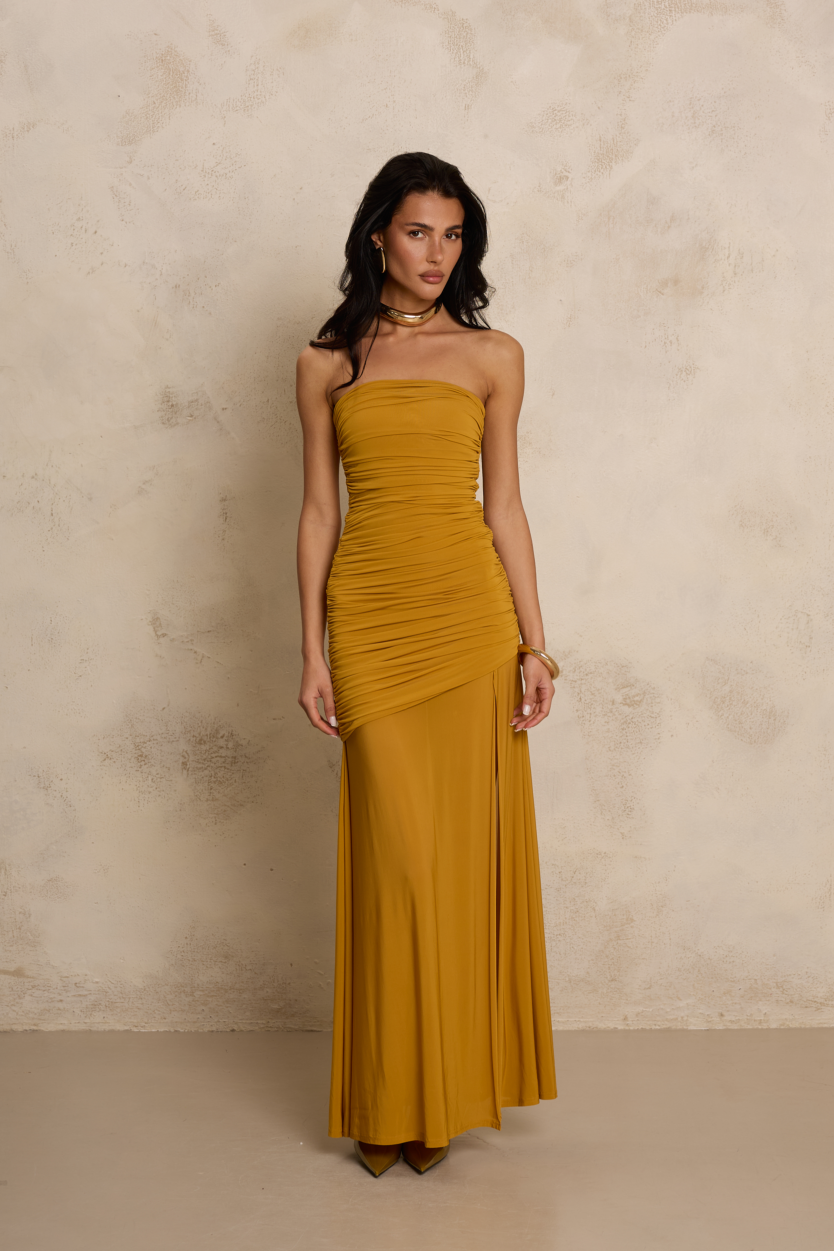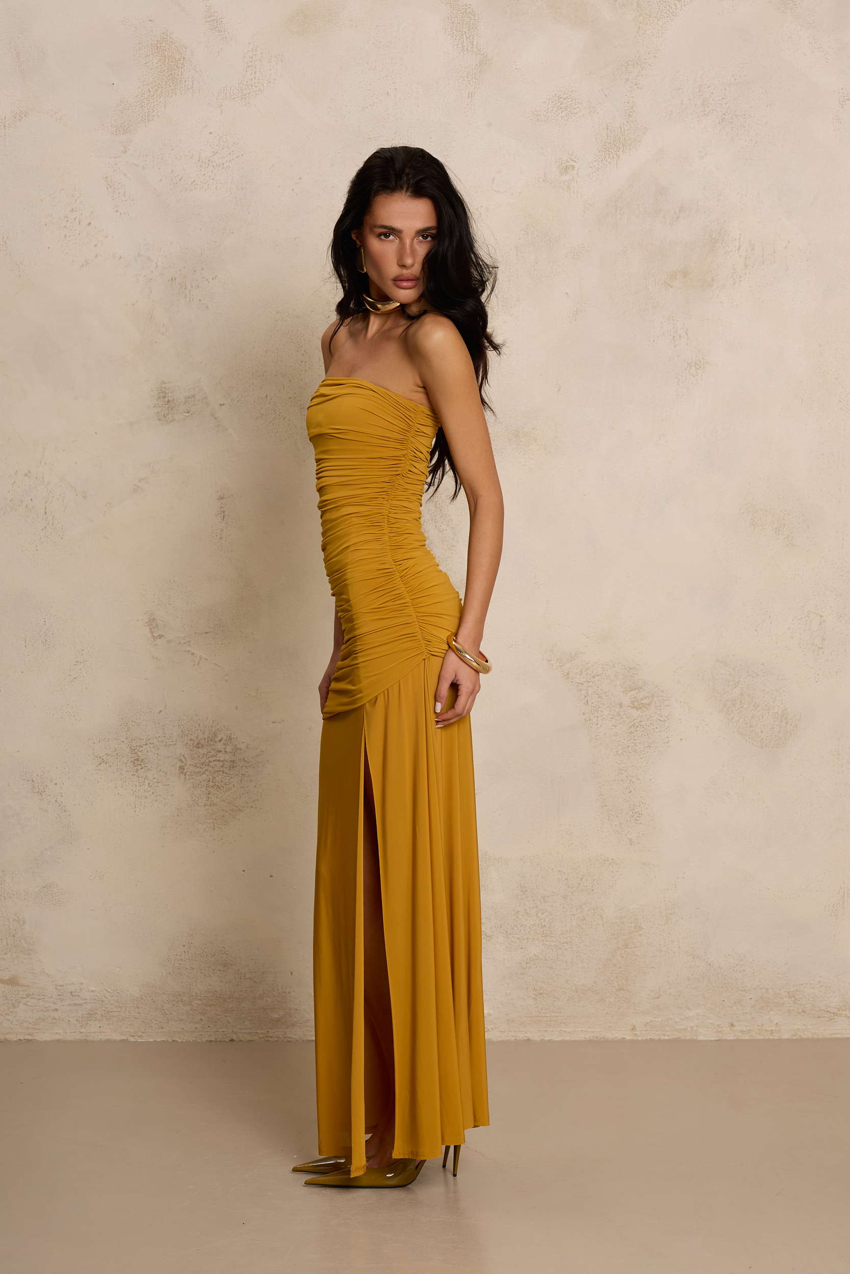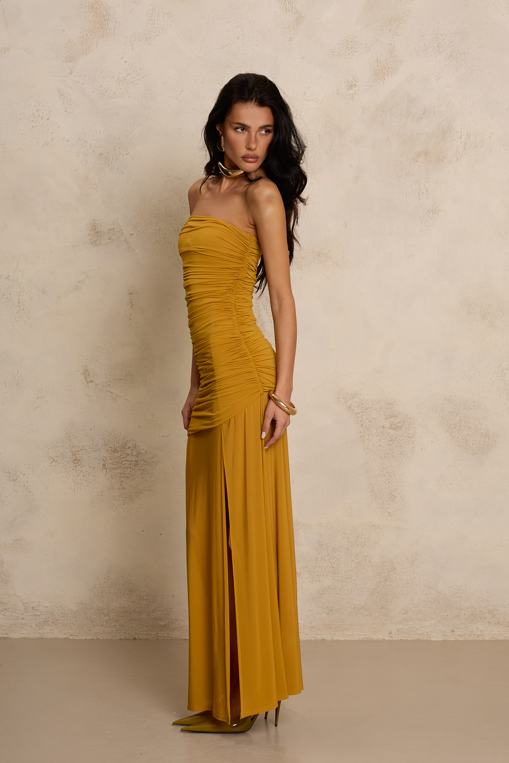 Elegancka sukienka maxi o czystej, nowoczesnej formie, która zachwyca prostotą i perfekcyjnym dopasowaniem. Wykonana z wysokiej jakości, elastycznego jerseyu, miękko otula sylwetkę, podkreślając jej naturalne proporcje. Góra typu bandeau subtelnie eksponuje ramiona i dekolt, tworząc kobiecą, minimalistyczną linię. Dopasowana część w okolicy talii i bioder została wykończona delikatnymi marszczeniami, które modelują sylwetkę i dodają całości wyrafinowanej struktury. Dół sukienki przechodzi w swobodnie opływającą, lekko rozszerzaną formę maxi, która pięknie porusza się przy każdym kroku i optycznie wydłuża sylwetkę. Intensywny odcień kurkumy nadaje stylizacji wyrazistości i nowoczesnego charakteru, idealnie komponując się zarówno z minimalistycznymi dodatkami, jak i bardziej wyrazistą biżuterią.