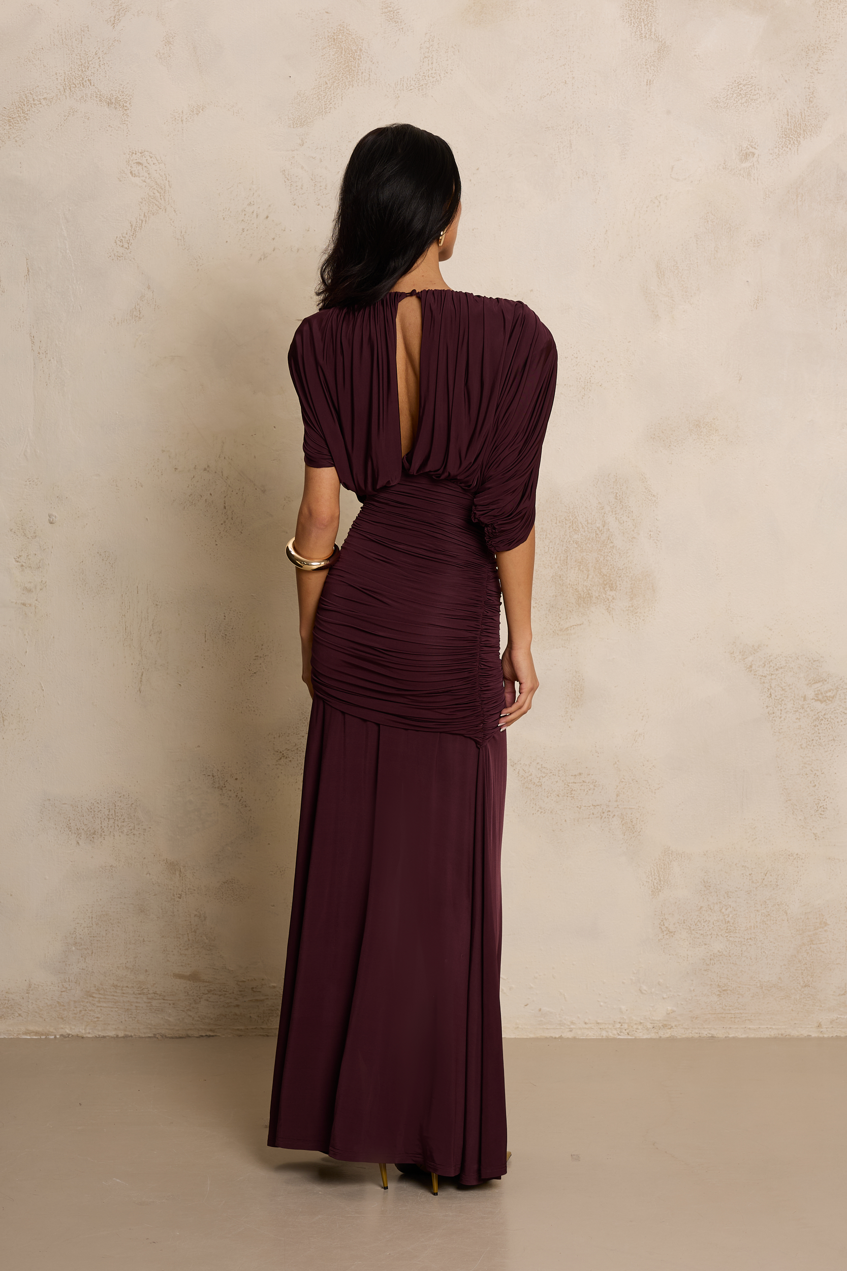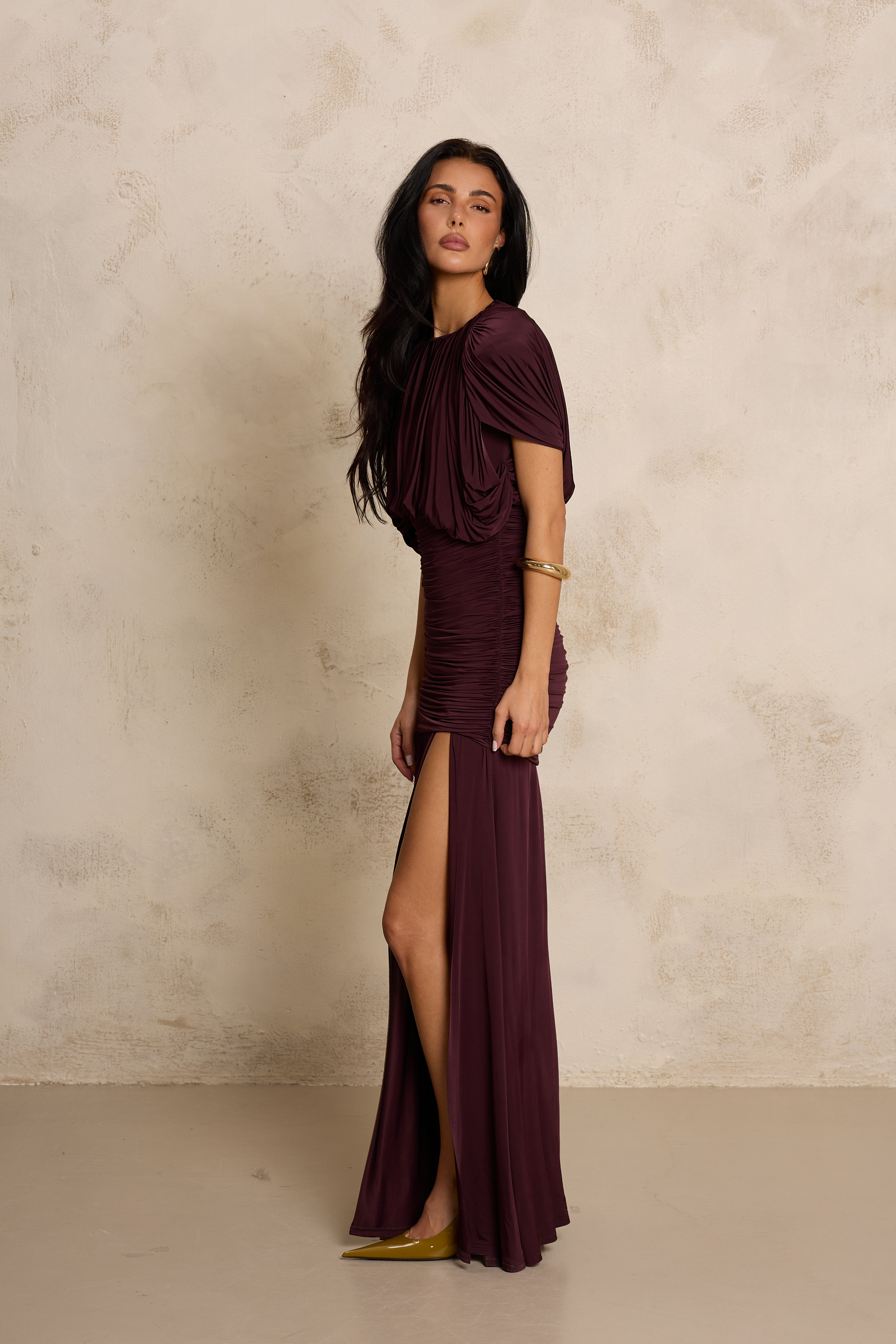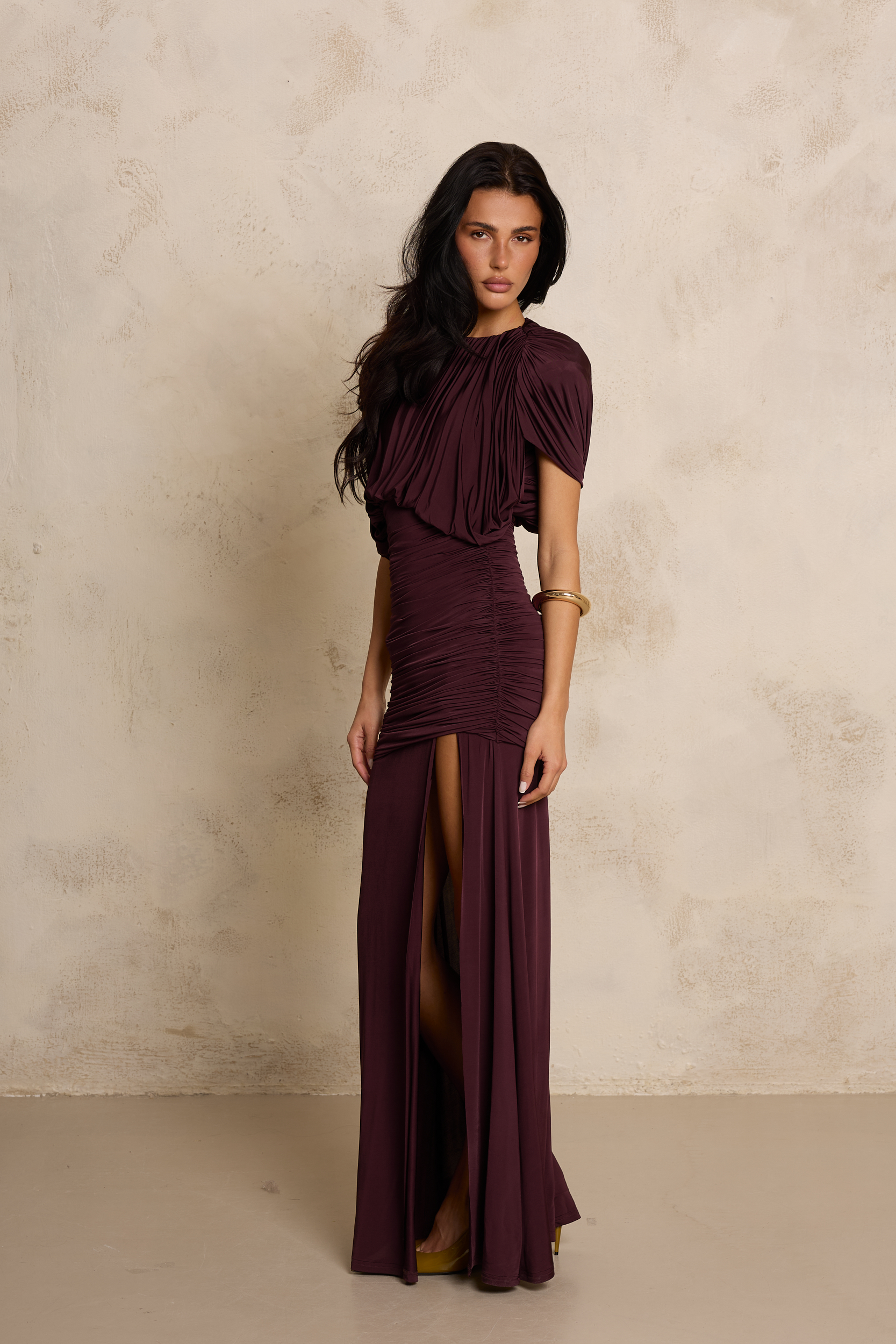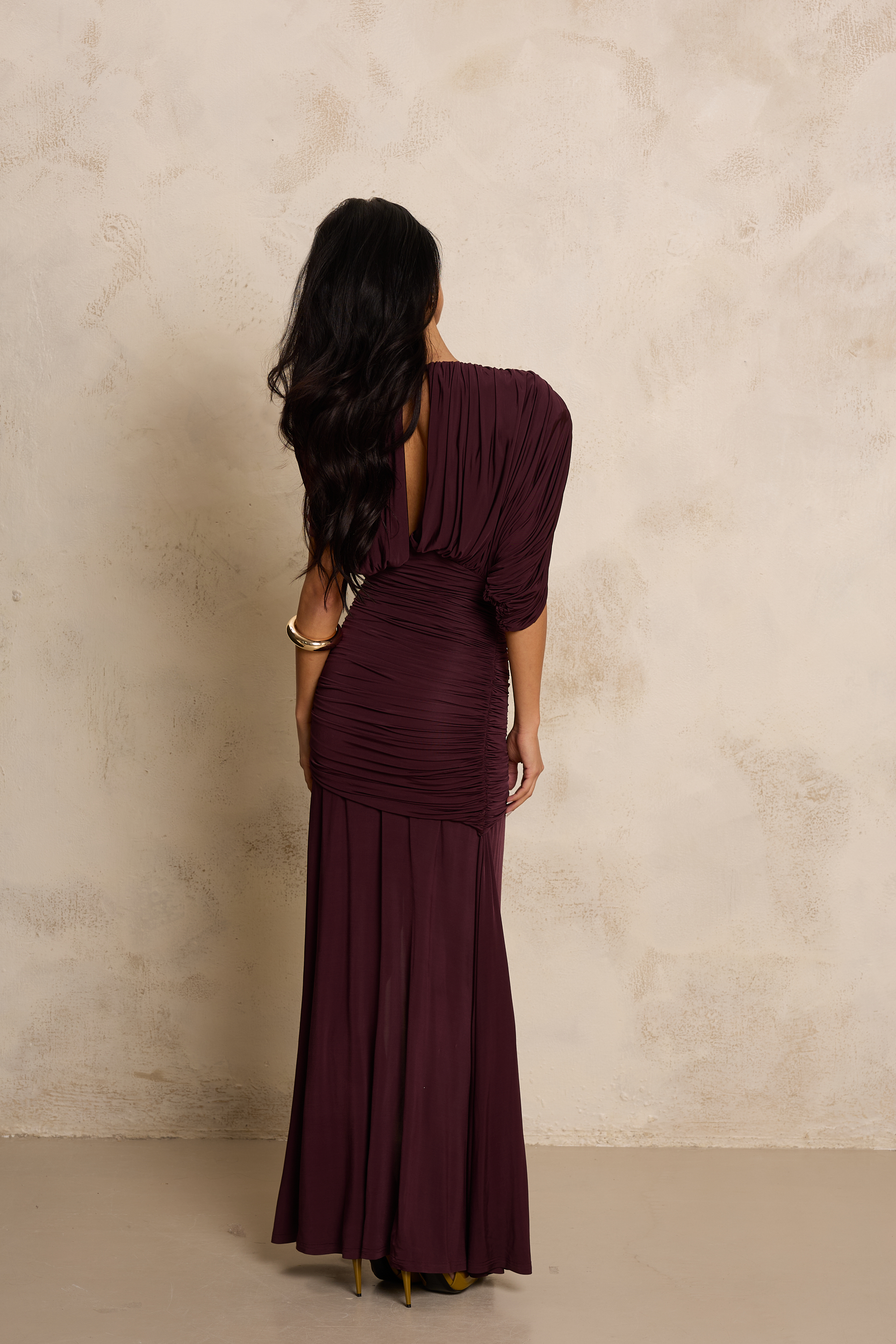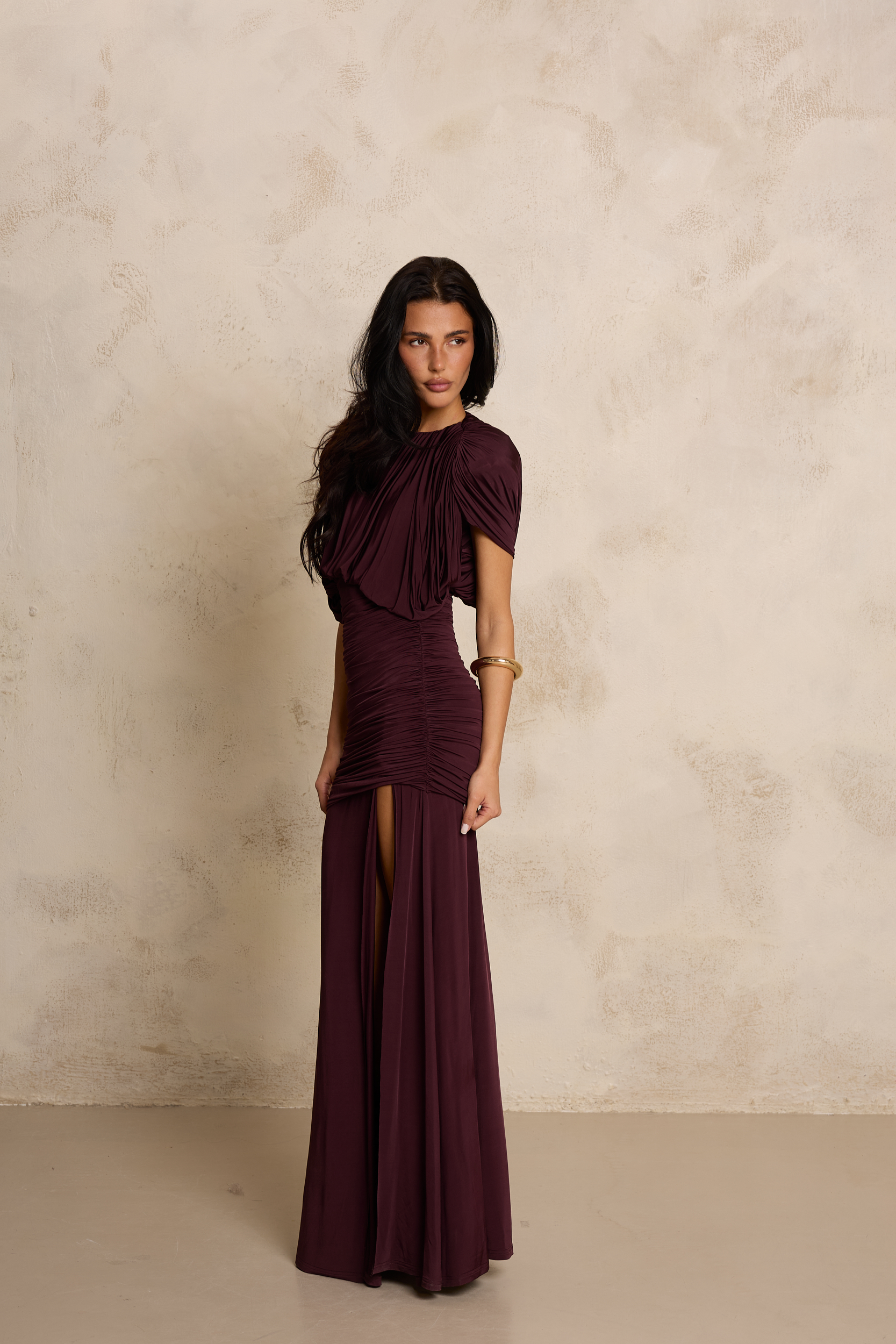 Ta zmysłowa sukienka w głębokim, śliwkowym odcieniu burgundu to esencja elegancji i kobiecego wyrafinowania. Wykonana z wysokiej jakości, elastycznego jerseyu, perfekcyjnie dopasowuje się do sylwetki, podkreślając jej kształty i zapewniając maksymalny komfort noszenia. Góra o luźniejszym kroju z efektownymi marszczeniami tworzy miękką, drapowaną formę, która subtelnie otula ramiona i dodaje stylizacji lekkości. Tył sukienki przyciąga uwagę efektownym, subtelnym wycięciem na plecach, które pięknie eksponuje ich linię i dodaje stylizacji zmysłowości. Górna część z delikatnym drapowaniem miękko opada, tworząc elegancki, lekko lejący efekt. Dopasowana, marszczona talia modeluje figurę, a długi, lejący dół z wysokim rozcięciem na nodze nadaje całości zmysłowego charakteru i pięknie eksponuje nogę w ruchu. Głęboki kolor podkreśla elegancję projektu, czyniąc sukienkę idealnym wyborem na wyjątkowe okazje i wieczorne wyjścia.
