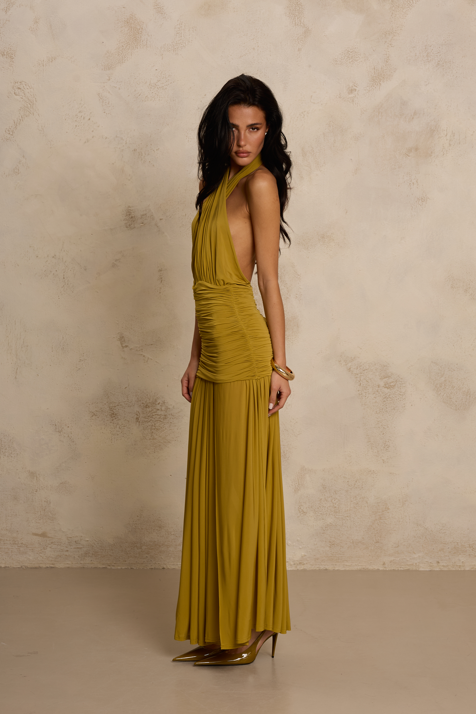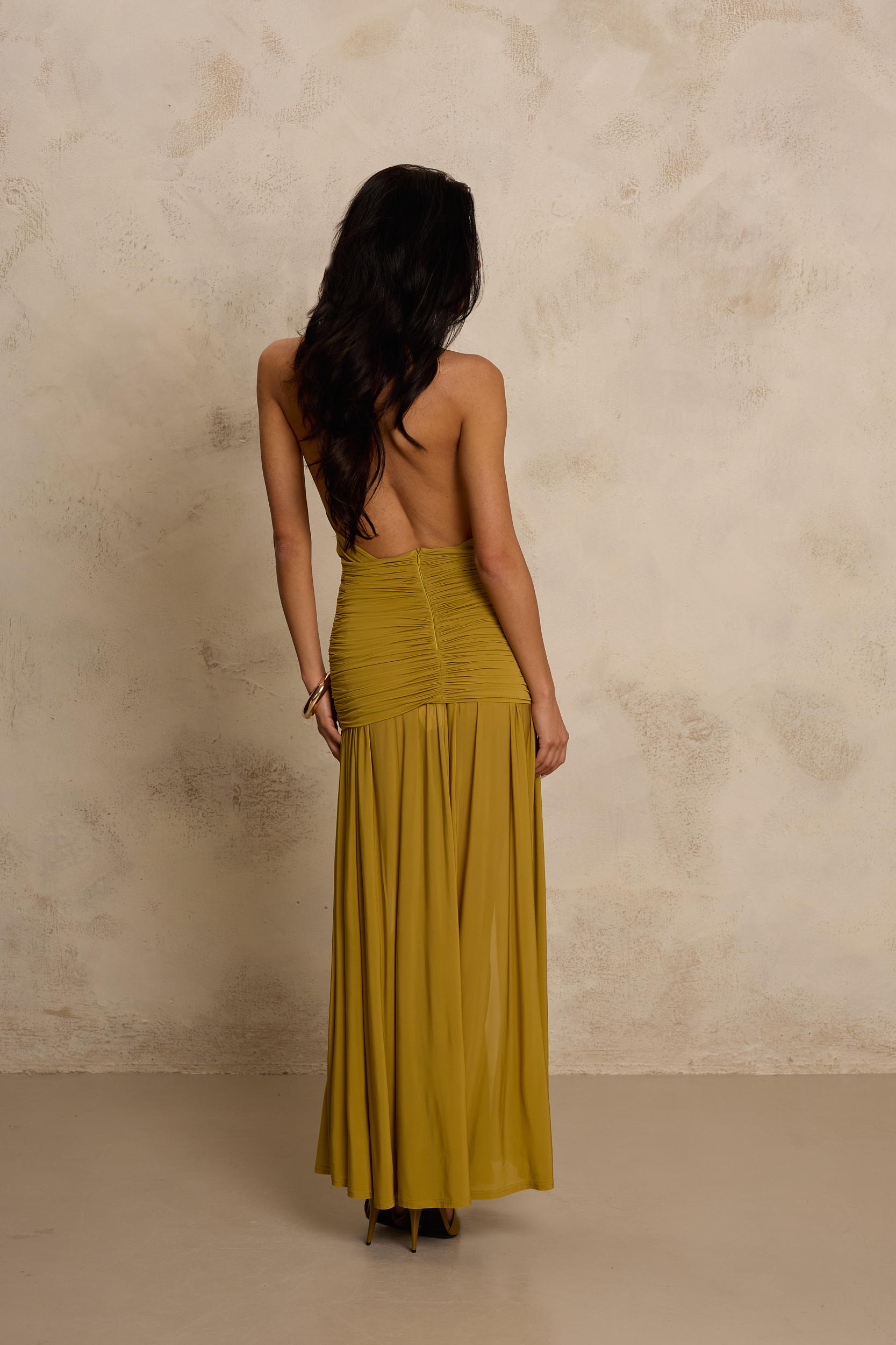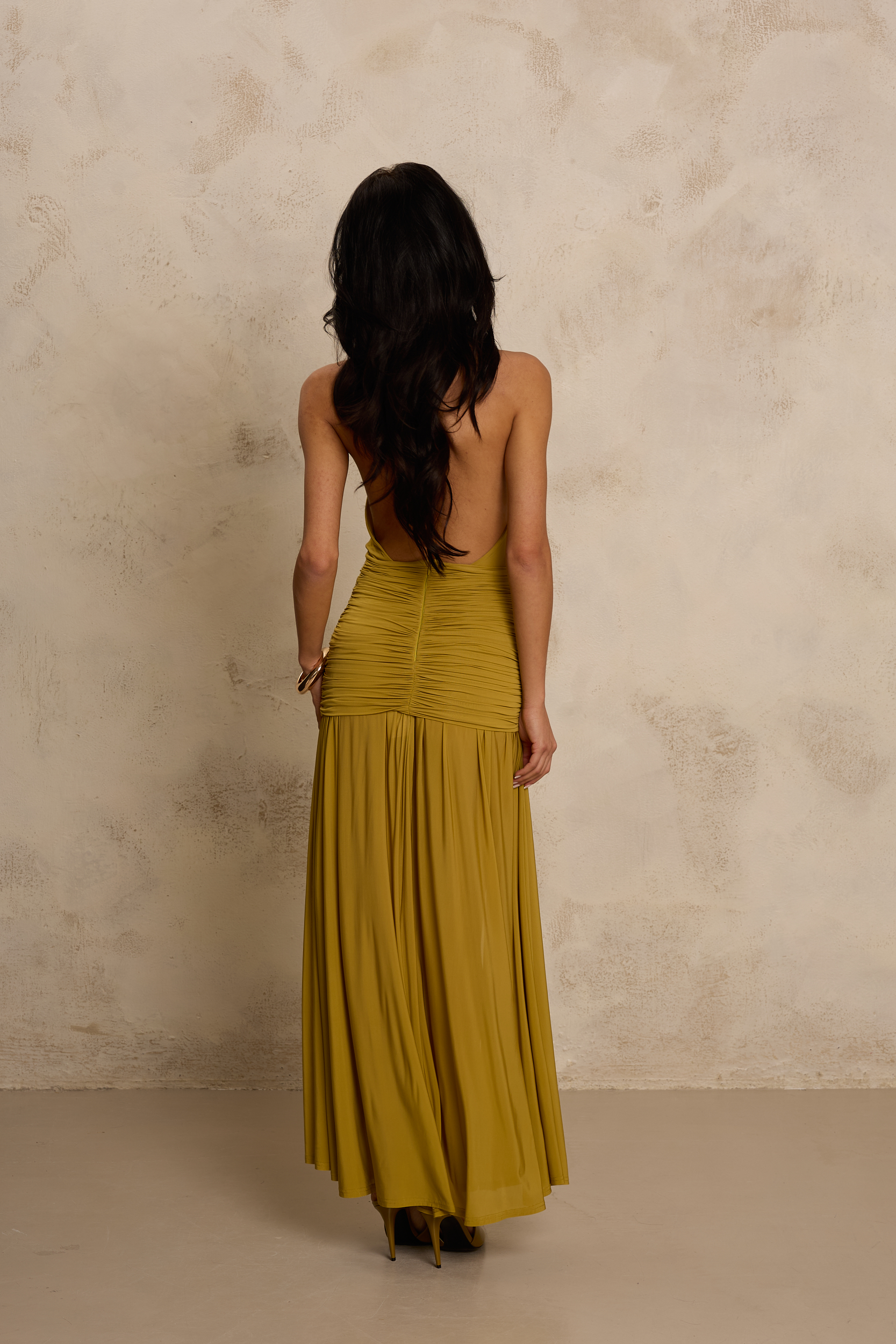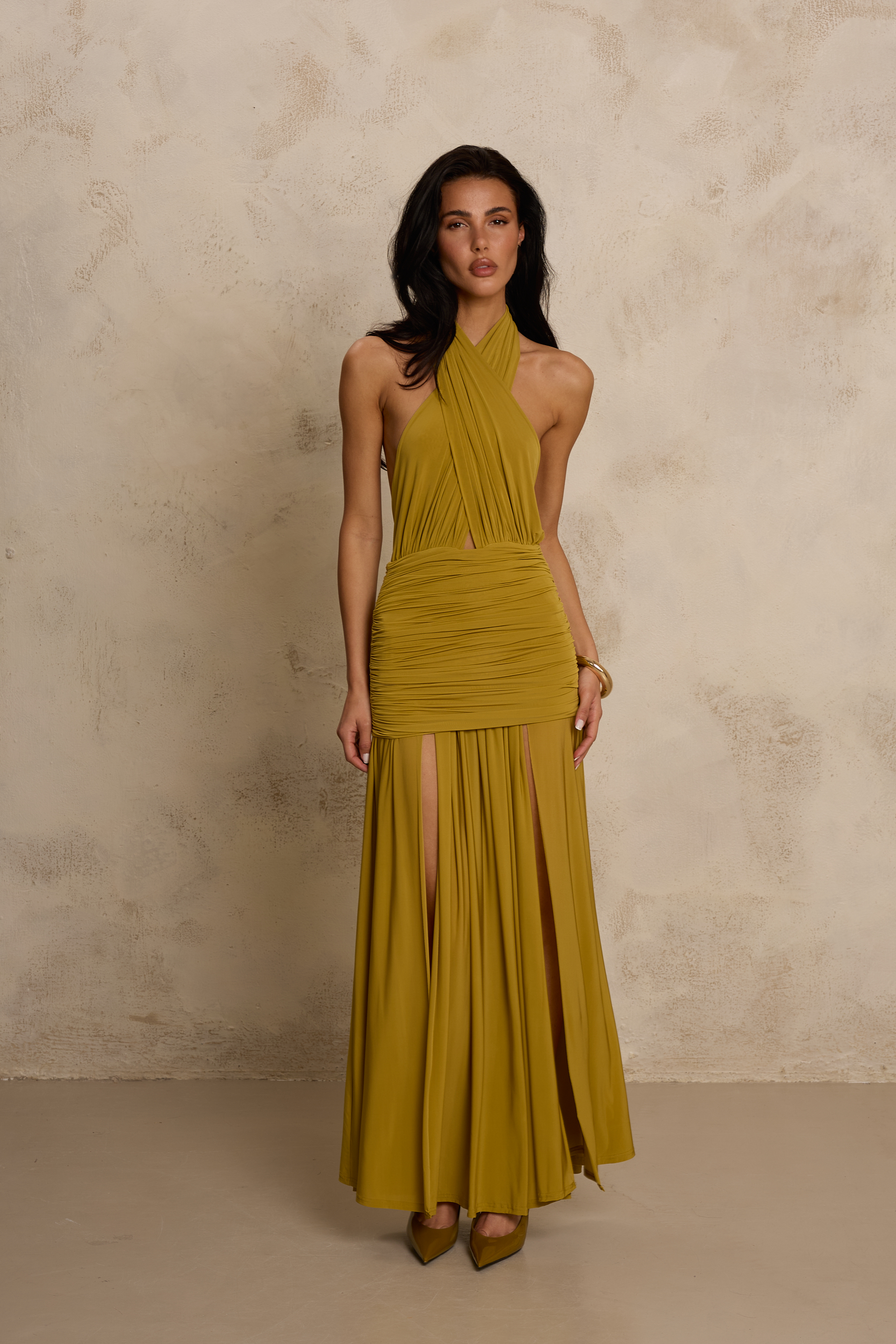 Efektowna sukienka maxi w zmysłowym, oliwkowym odcieniu zieleni, która zachwyca swoją formą i wyrafinowanymi detalami. Góra z przeplotem wokół szyi miękko układa się na sylwetce, eksponując ramiona i dekolt. Dopasowana talia z marszczeniami podkreśla kobiece kształty, tworząc harmonijną linię sylwetki. Długa, lejąca spódnica nadaje całości lekkości i elegancji, a subtelne rozcięcie dodaje zmysłowego charakteru. Tył sukienki odsłania plecy, nadając stylizacji wyjątkowej lekkości i nowoczesnej elegancji. Drapowania w talii pięknie modelują sylwetkę również z tyłu, a miękko opadający dół porusza się z każdym krokiem, tworząc niezwykle kobiecy efekt. To idealna propozycja na wyjątkowe okazje – od letnich przyjęć po wieczorne wyjścia, gdzie liczy się styl, komfort i wyrafinowany minimalizm.
