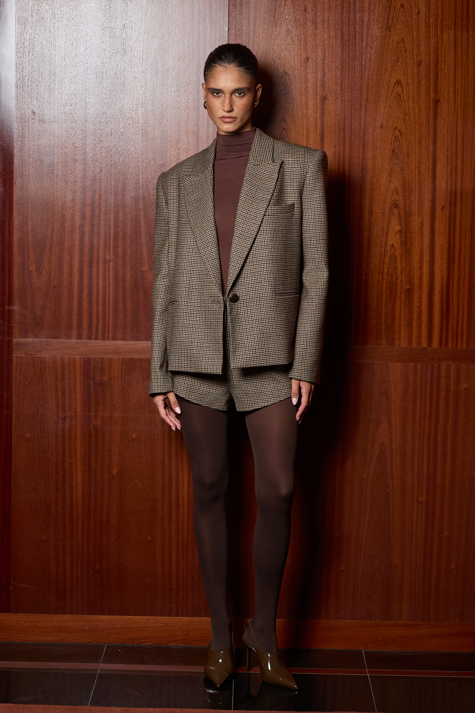 Marynarka wykonana z luksusowej mieszanki wełny i jedwabiu w klasyczny deseń pepitki, która łączy ponadczasową elegancję z nowoczesnym charakterem. Jej strukturalna forma z podkreślonymi ramionami nadaje sylwetce wyrazistości i siły, jednocześnie pozostając wierna zasadzie minimalistycznego szyku. Jedwabny dodatek w tkaninie subtelnie rozświetla materiał, podkreślając jego szlachetny charakter. Klasyczne klapy, pojedyncze zapięcie na guzik wykonany z czekoladowej skóry i perfekcyjnie wykończone detale tworzą spójną całość, idealną zarówno do stylizacji formalnych, jak i casualowych. Marynarka najlepiej prezentuje się w komplecie z szortami w pepitkę uszytymi z tej samej tkaniny, tworząc nowoczesny garnitur w reinterpretacji klasyki. To wyjątkowy element garderoby, który podkreśla luksus w subtelnym wydaniu – ponadczasowy, ale z wyraźnym, współczesnym twistem.